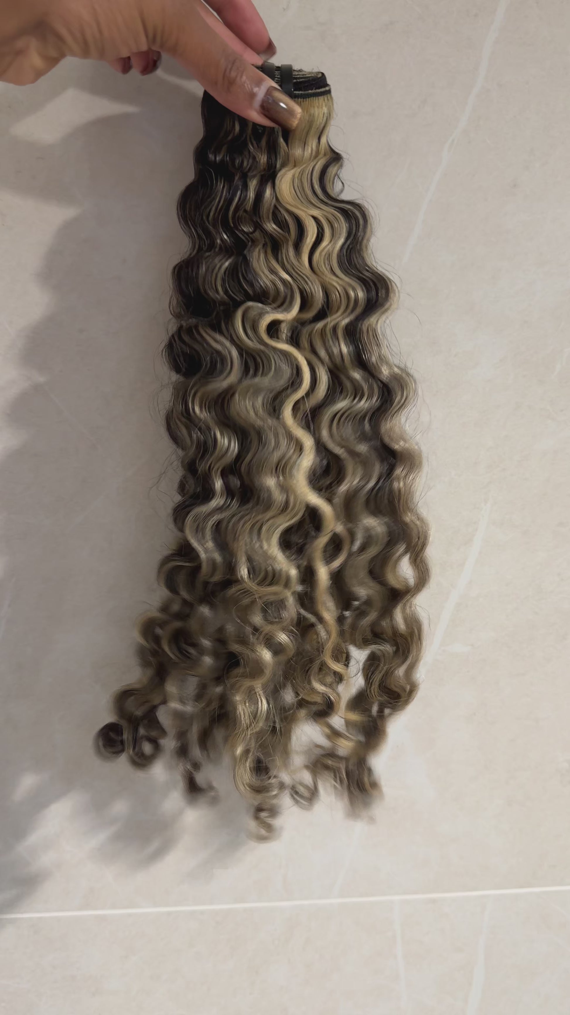 A stunning single-donor Burmese curly texture enhanced with soft blonde highlights for a beautifully dimensional look.