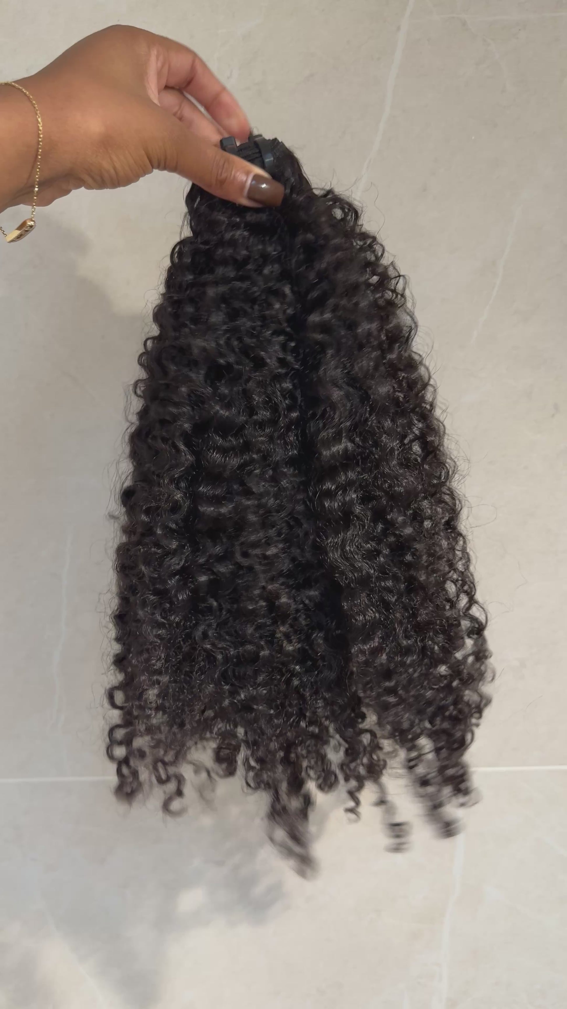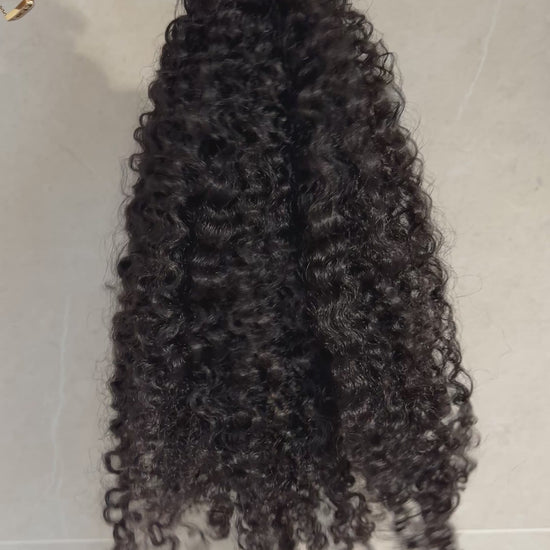 Model is wearing 22 inches ( 3 bundles) of our Raw Burmese Tight Curl hair in a flip-over U-Part wig. A beautiful tight, defined curl pattern looser than kinky-curly but still full, coily and voluminous. This texture blends seamlessly with Type 4 natural hair, especially when styled using curl creams, mousse or leave-in conditioners.